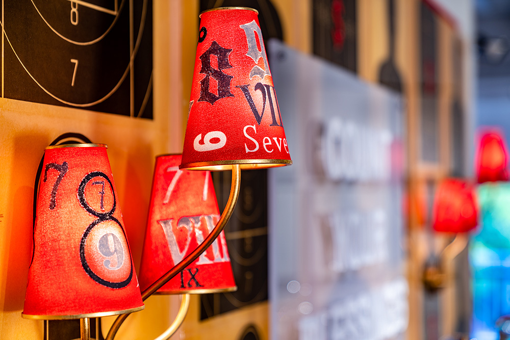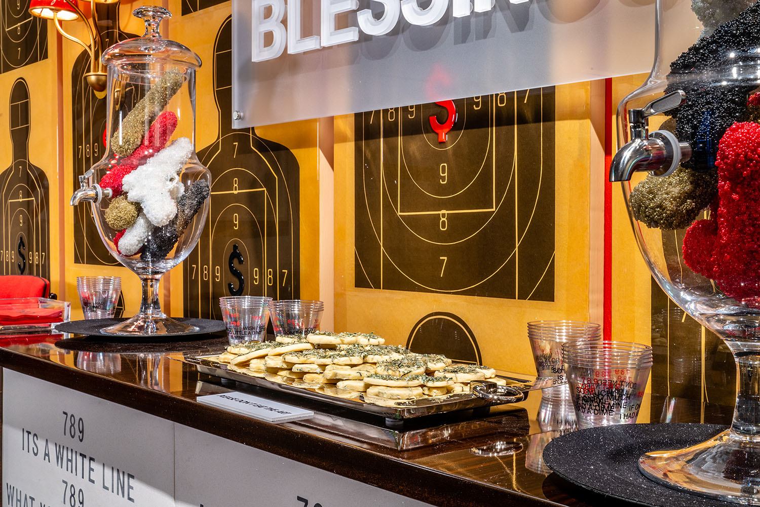 resin on wood panels, acrylic panel with pin mounted letters, sconces with painted lampshades, glass beverage container, plastic cups, silver plated tray with cookies, chairs with embroidered seats