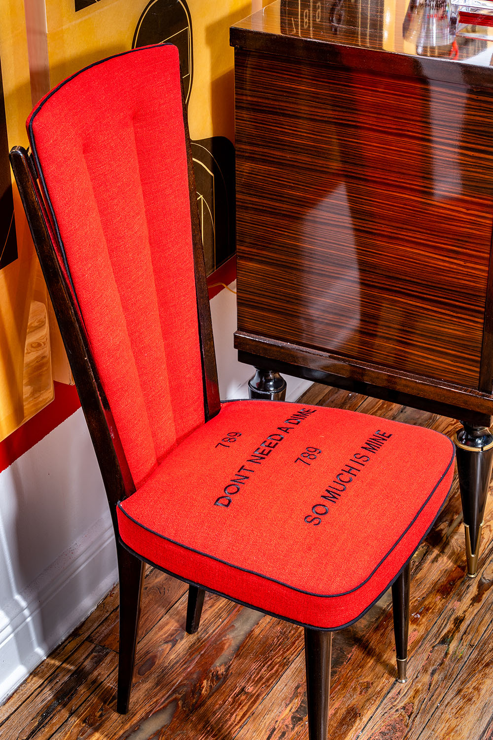 This is a complex assemblage piece using various symbols and multiple methods of construction. The numerology of the target panels–7,8,9–is reflected in the “haiku” like verses on the cabinet panels and the decoration on the lamp shades. The side chairs also have embroidered verses. The hidden conversation about money and blessings is reflected in various elements including shortbread “cookies” on a central tray made with shredded money.