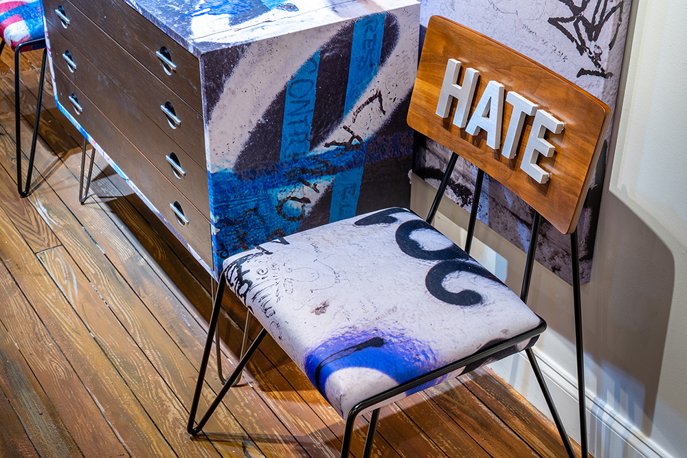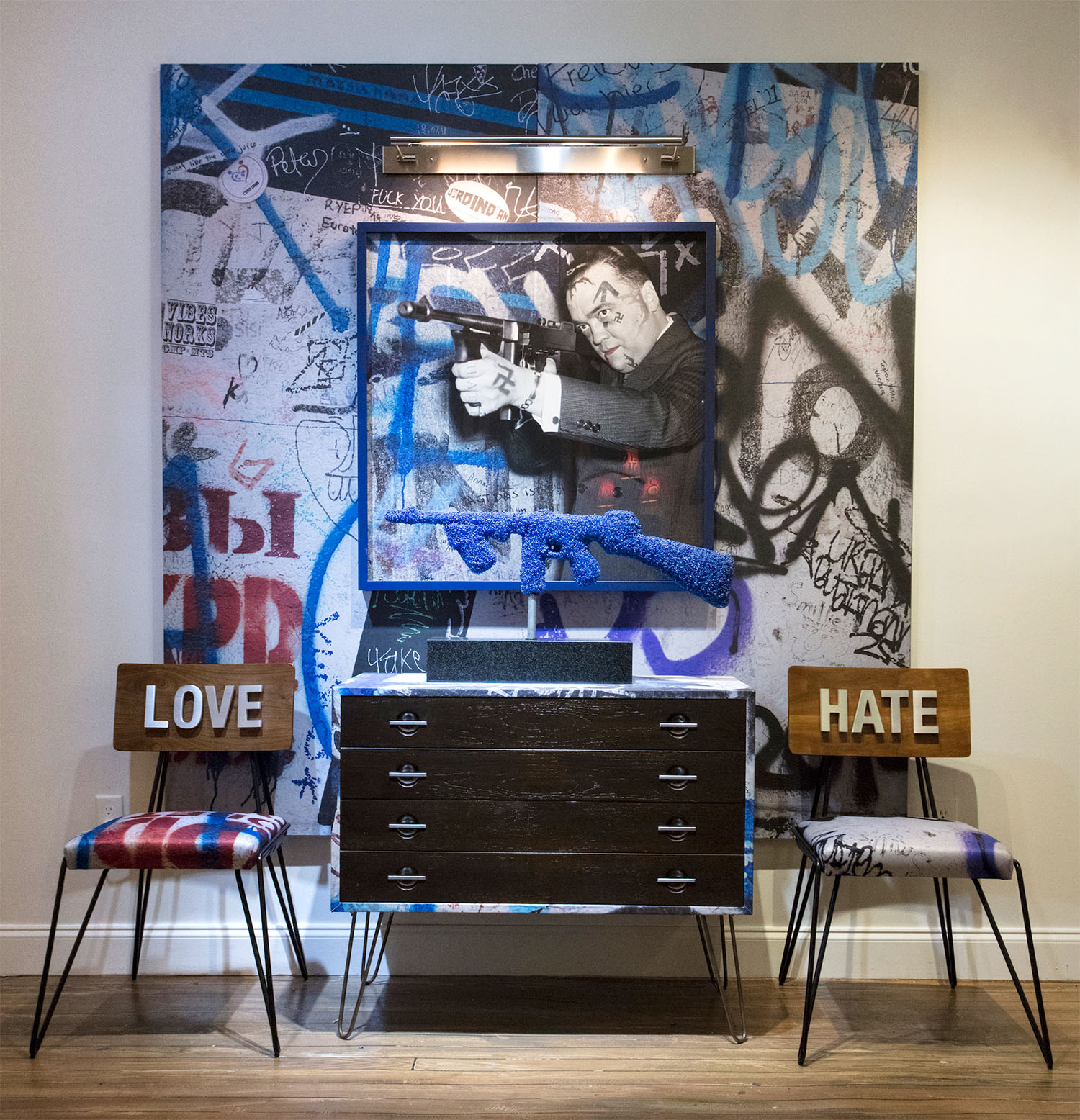 This work explores the ideas of freedom and government. The backdrop is a photograph taken of the Berlin Wall, a potent and popular symbol of the people’s will over oppressive governments. On top of this, an altered archival photograph of J. Edgar Hoover aiming a tommy-gun becomes a foil to the German experience. Nazi tattoos and lipstick position governmental authority as corrupt and suspect. A beaded tommy-gun sculpture demonstrates the ease by which the ugly can be disguised as beautiful. The cabinet case it sits upon, and the chairs that flank it are covered in the same photograph used in the backdrop, with the words LOVE and HATE mounted to back of each as if to suggest the viewer must choose an option.