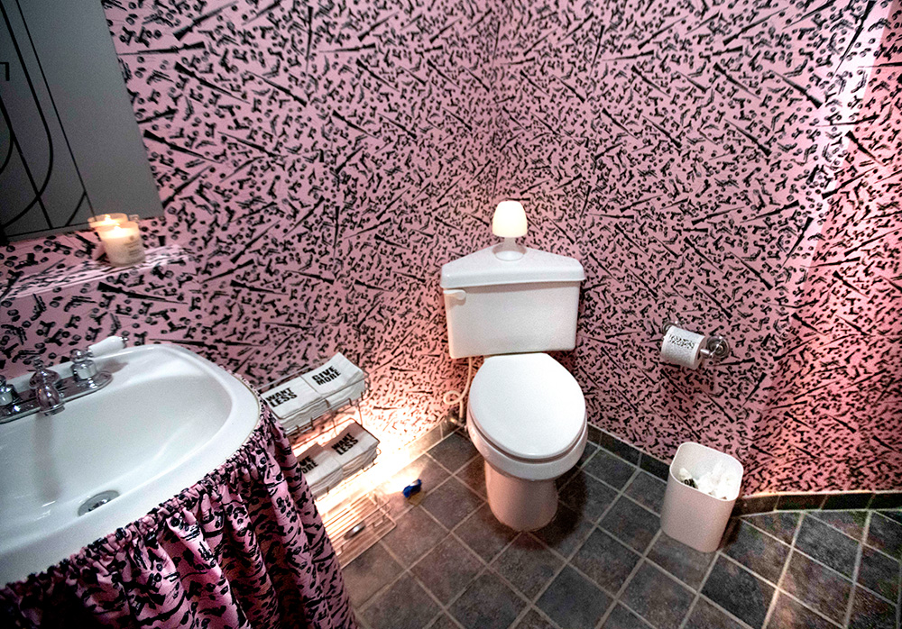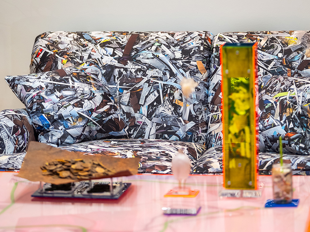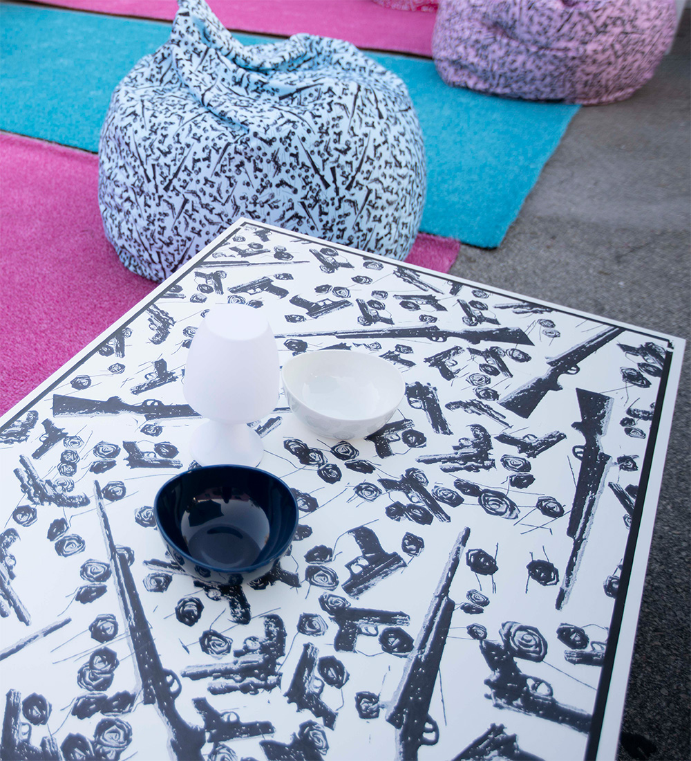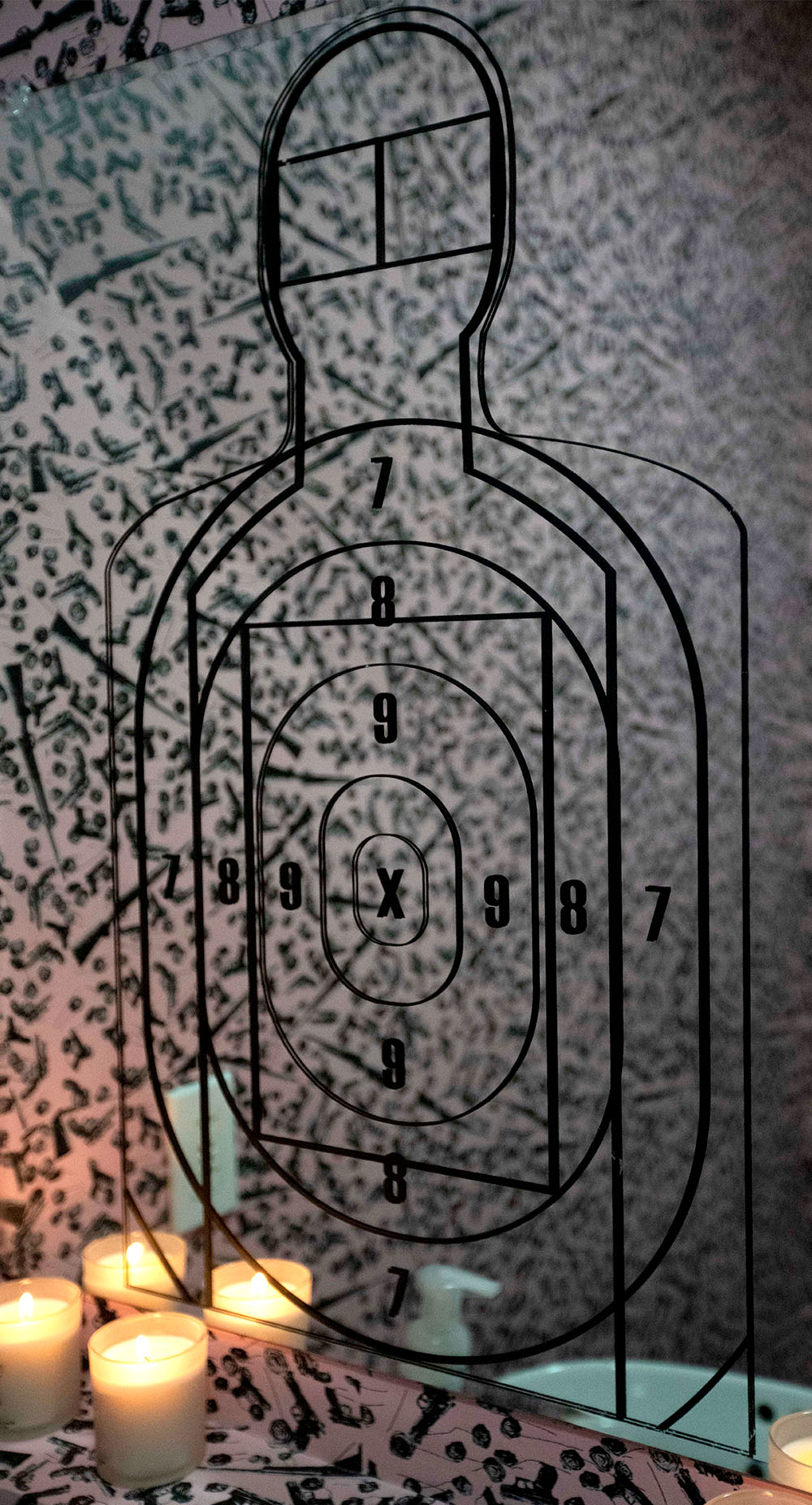 A spatial and thematic experience where every surface is covered in a variation of the same fabric printed with “guns and roses” imagery taken from previous sculptures. The space created provided a place to sit, but not to get too comfortable, while talking about the difficult ideas presented within the exhibition A Question of Morals.