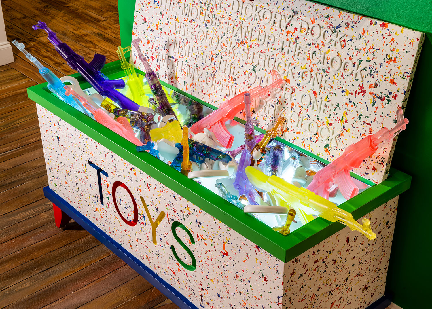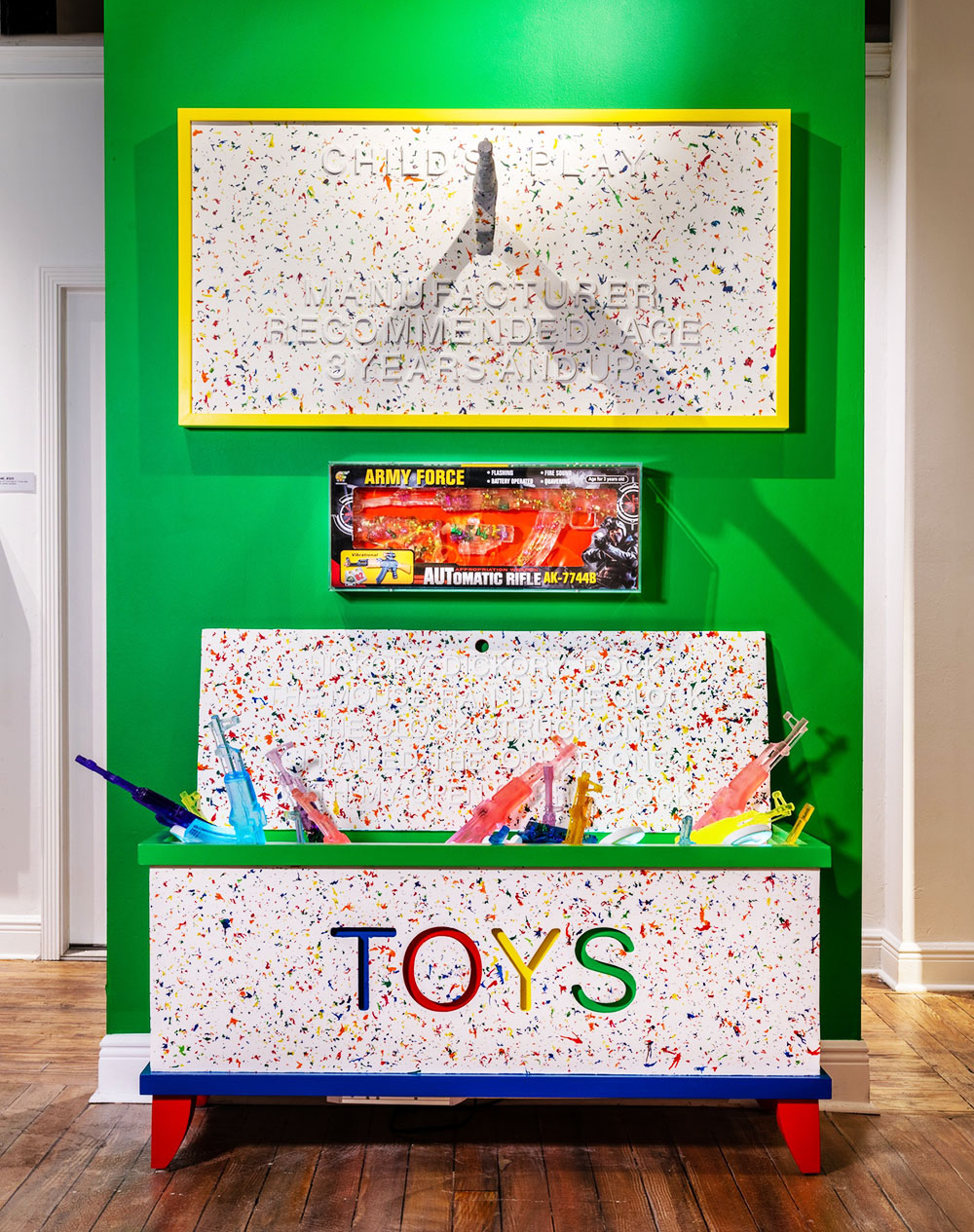 Child’s Play came about as I started to work with gun imagery and required three-dimensional guns. I found that it was not responsible to use real, functioning guns in the work, so I began to buy toy assault rifles. It wasn’t until I was telling someone that I was buying these toys through the internet that it struck me, I was indeed buying these “toys” on the internet… which were being marketed as “great gift ideas”. The more that I looked at the various toy guns for sale the more I noticed a pattern of the same sales pitch along the lines of: “your kids will love spending hours playing with these realistic toy assault rifles”. Each gun had a manufacturer’s recommended age, typically 3 years and up, but generally only because there are small, swallowable parts in the toy assault rifle that could lead to choking. However, I came to find the idea that the only hesitation with recommending an age limit was the precaution of a child swallowing a small part, not the aggressive and deadly behavior which is inherently encouraged in its use.