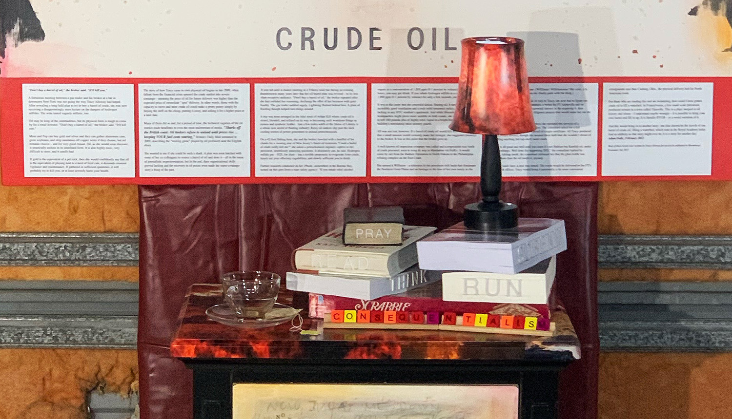 digital print on canvas, oil paint, antique chest of drawers, antique side chairs, antique bronze lamps, custom lampshades, bronze cast skull, plexiglass