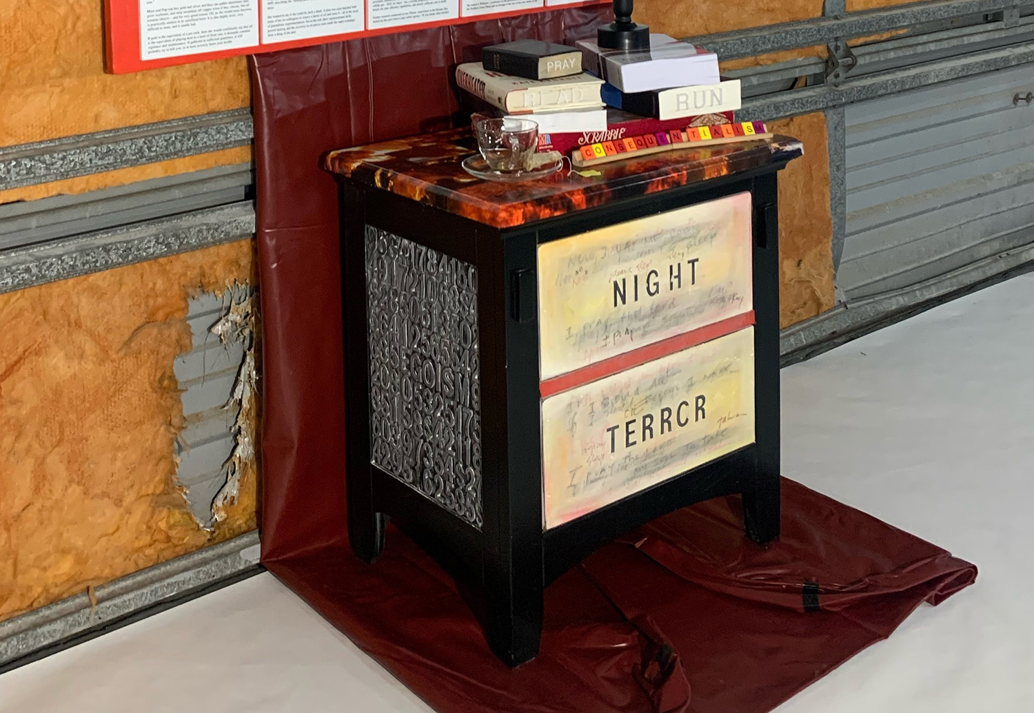 After a trip to visit a Guatemalan philanthropic organization, I became interested in the relationship of contemporary gang violence and historical colonialism. The violence that arrived with the European explorers and later revisited in the Latin American land wars. The history of colonial violence today generationally lives in the history of regional gang violence. As I researched both gang imagery and portraiture in art history, I was struck by the similarities in a painting by Giovani Battista Moroni and a photograph of a leader of the Mara Salvatrucha, MS-13 gang. In light of this coincidental intersection, I developed an assemblage of a renaissance gang portrait, “tattooed” 19th century Italian chest and 19th century bronze lamps with lampshades, along with other elements correlating to my research into these subjects.
