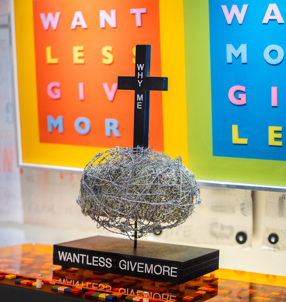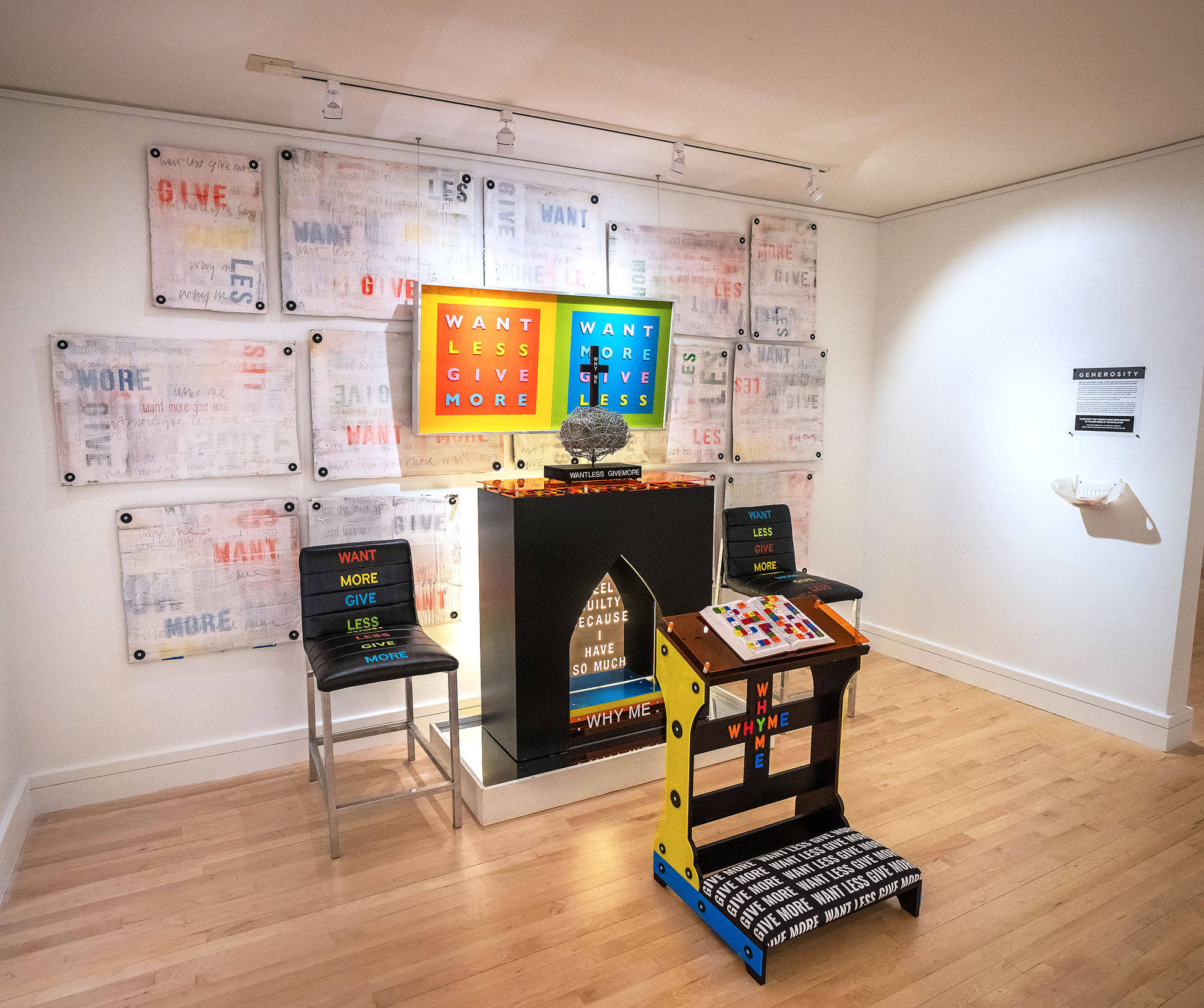Want Less / Give More emerged from a period of personal transition following a visit to Guatemala before Covid, when witnessing profound inequity led me to simplify my own life in order to give more fully, marking a continuation of a long spiritual and ethical reckoning that began years earlier. The installation confronts the uncomfortable truth that growth and empathy often arise from pain rather than happiness, asking viewers to face the moral tension between generosity and indifference, and the haunting question of “WHY ME?”—why some are compelled to see and respond to injustice despite knowing it cannot be fully resolved. Through reclaimed materials, direct language, and forms that reference religious, domestic, and communal spaces, the work invites reflection, participation, and self-examination around responsibility, compassion, and the contradictions of human existence.For a full description click here.