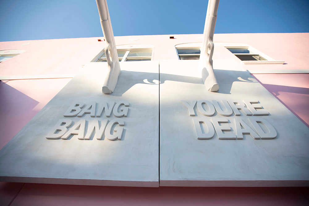 This sculpture conjures the idea of a young girl’s phone, with the disconnect between the fantasy created in American leisure-life and the reality of gun violence in children’s lives today. This photo was taken in Berlin near the Brandenburg Gate.