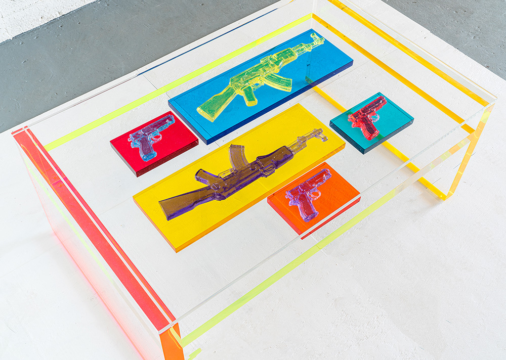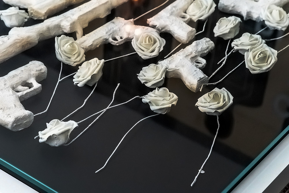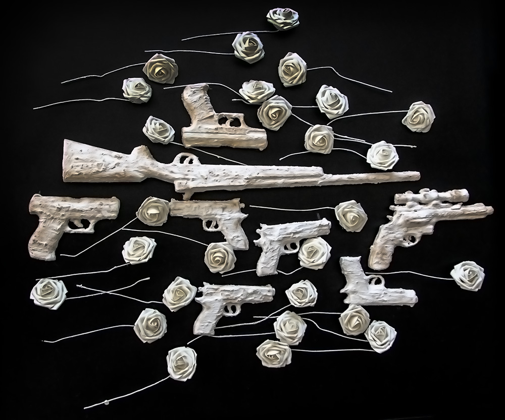 An exercise in understanding how beauty can affect the viewer’s ability to decode an object. In it I explore the relationship between the gun and the rose, as symbols and as objects. This sculpture is a participatory piece where fresh roses are added by the viewer to complete the connection, beyond the artist.