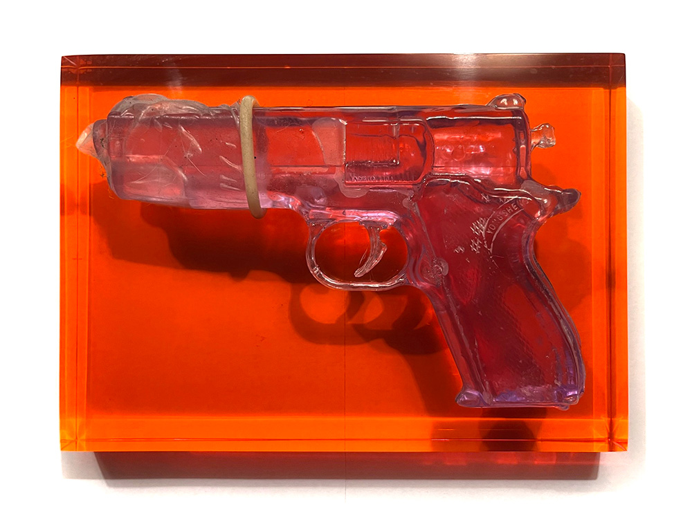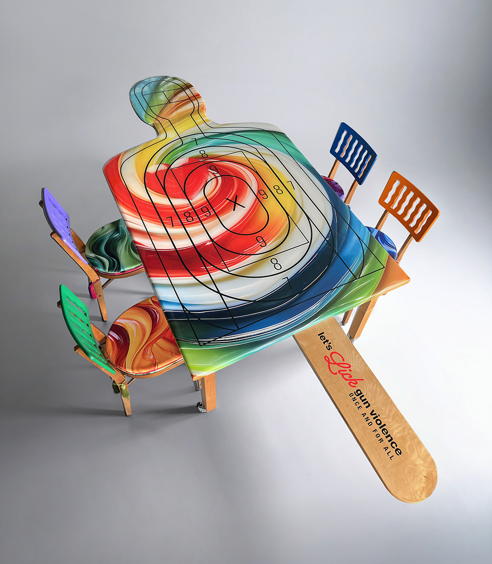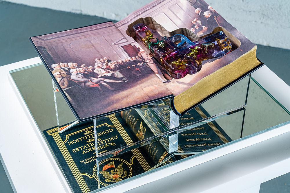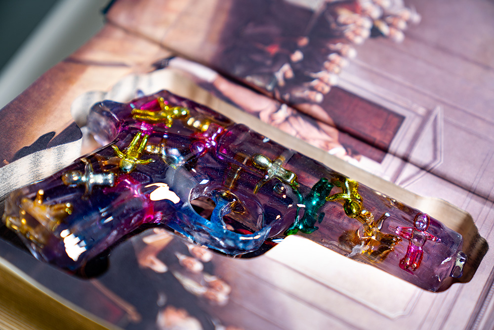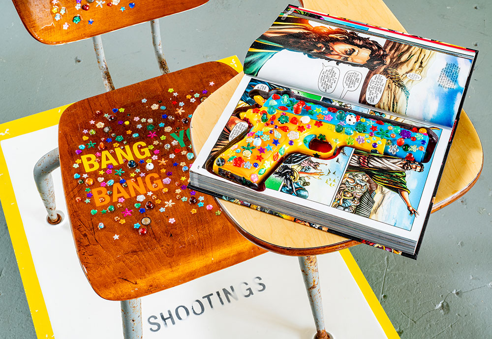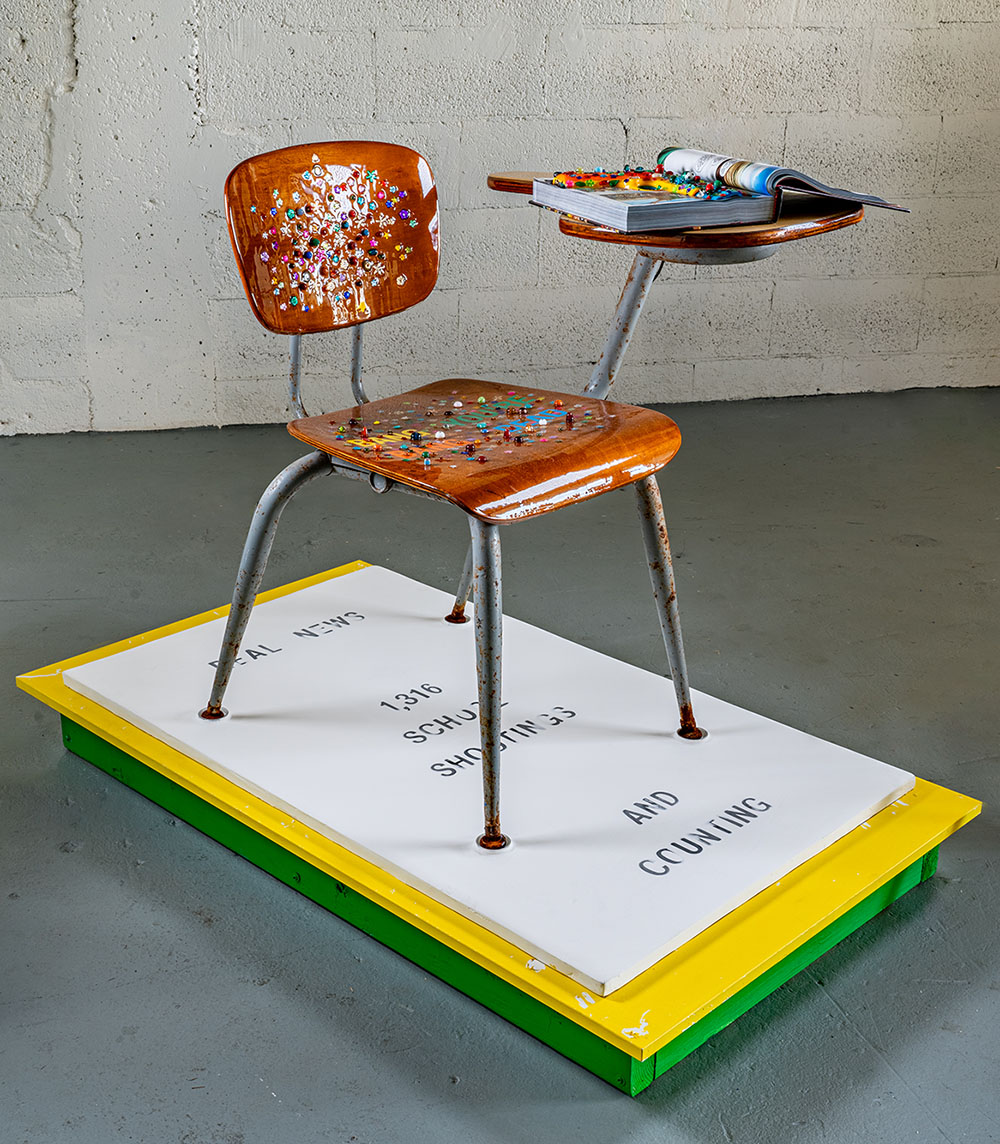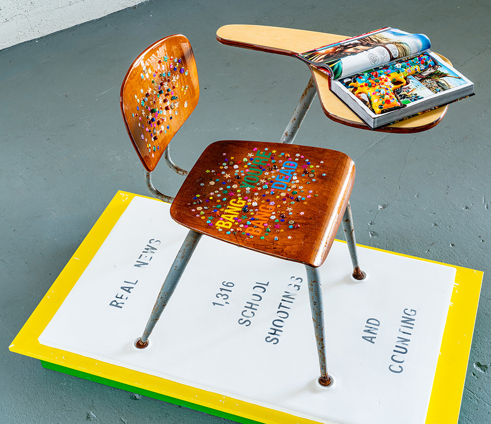 The idea of school safety is symbolized by an empty school desk, bedazzled with flowers and beads, along with the inscription: BANG BANG YOU’RE DEAD in reference to my sculpture of the same name. The book is an opened Bible safe holding a bedazzled gun as if to gloss over the hard truth of violence in our schools with no resolution in sight.