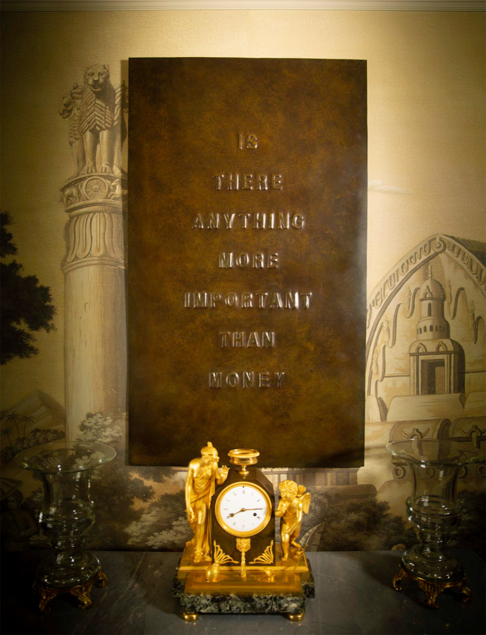 The work combines two disparate items from different centuries to create a contemporary conversation of ideas and meaning. The language panel is clear in its communication whereas the clock uses the veiled references to classical myth and symbolism to communicate a greater meaning in juxtaposition with the language in the bronze panel. The clock shows three elements: The clock face: Time. The figure to the left: Psyche: Soul. The figure to the right: Cupid: Love. Are these the answers to a simple question?