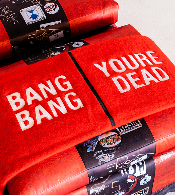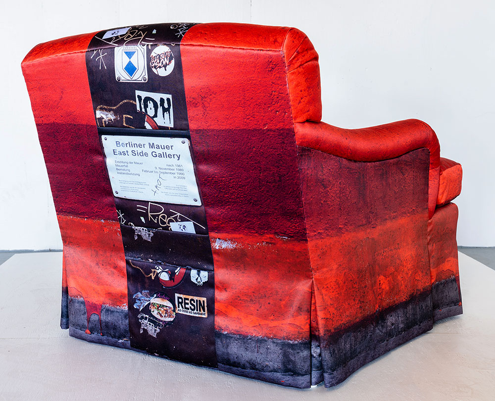 This club chair and ottoman are upholstered in fabric printed with an enlarged photo of the piece Bang Bang You’re Dead being displayed in front of the Berlin wall, taken in the summer of 2019 as part of a photographic series in which it was displayed in different European cities and public, outdoor contexts. The throw blanket is also designed around the piece, but distilled into embroidery on wool.
