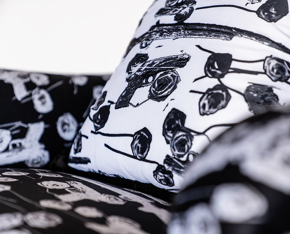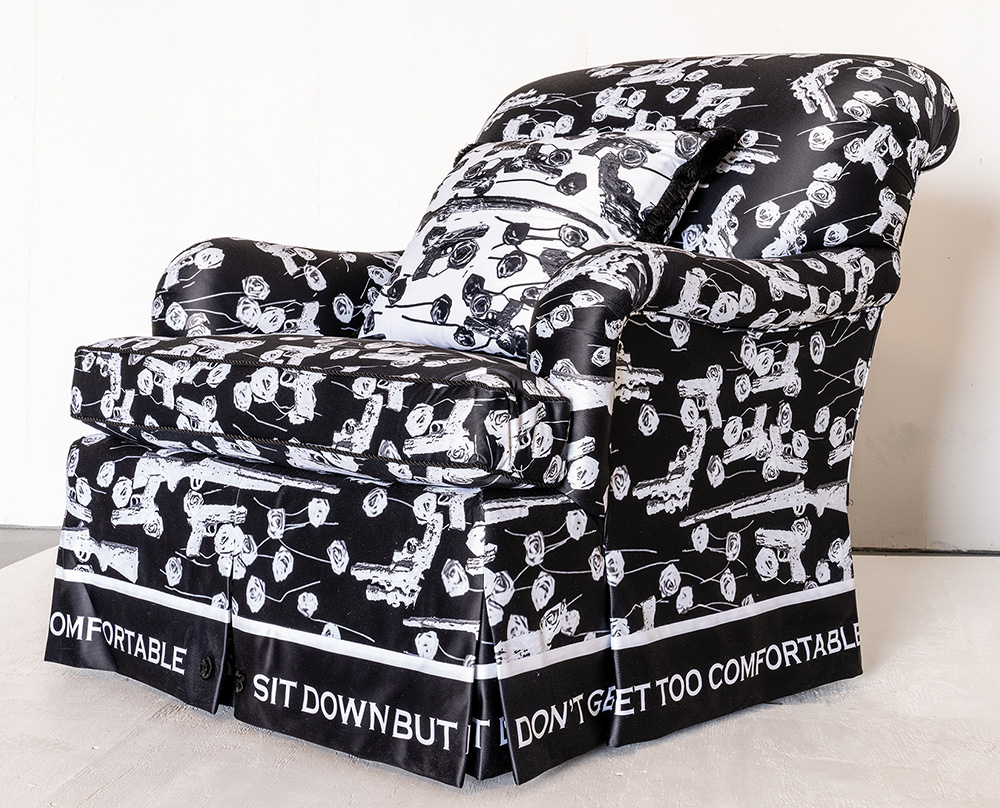 Printed on the fabric of this upholstered chair is an image of my sculpture “Guns and Roses”, made into a pattern, which represents the symbols of opposition occupying the same space. In this work I anthropomorphize the gun and the rose to reference male and female symbolism.