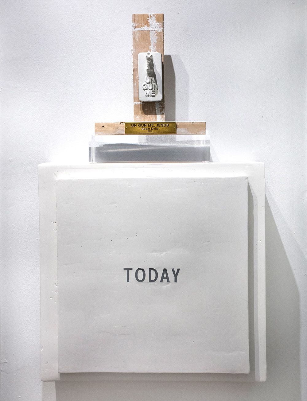This work incorporates a cell phone with a small pistol jutting out from it with the message–as if we were calling Jesus directly: Un gun me Jesus—–Today. The phone is mounted directly to an unfinished wood 2×4, with plaster slashes as if a cross. The museum gold leaf label attached lends an air of authenticity to this makeshift composition.