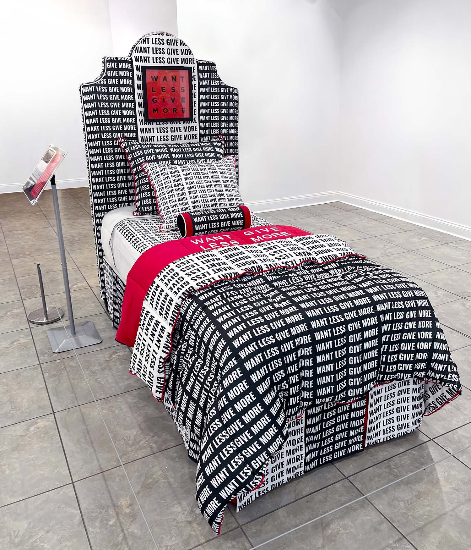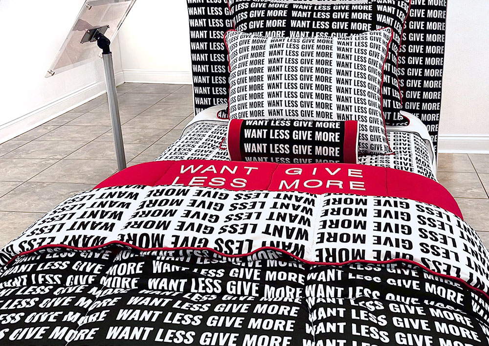 In the style of a bedding section display at a high-end department store, this sculpture employs a visually overt and subliminal mantra that, while simple, can amount to a larger impact when internalized and eventually acted upon by the viewer. von Dolle is interested in the ability of text and words to be absorbed subconsciously via the skin and eyes as light filters through the lighter portions of fabric onto, and into us during states of increased permeability and malleability while relaxing or sleeping. Since we easily absorb repetitive branding, logos, marketing and illuminated advertising, he aims to counteract the effects these things have on us (and of consumer culture in general), and attempts to cancel out its cultivation of greed by employing similar tactics using interior design methods to enforce a more ideal state of being.
