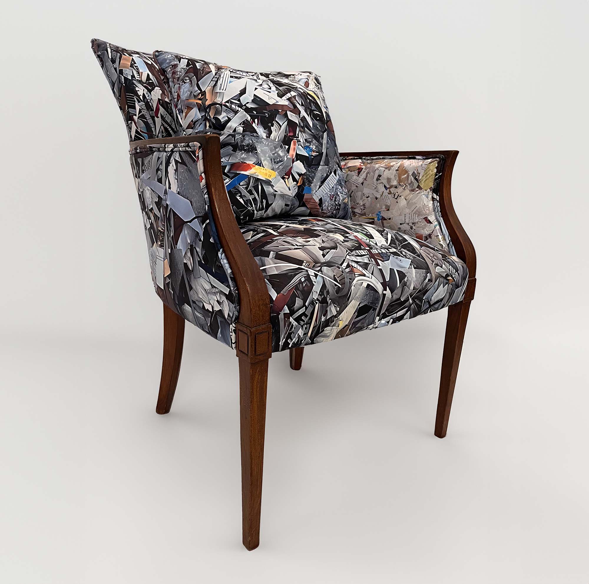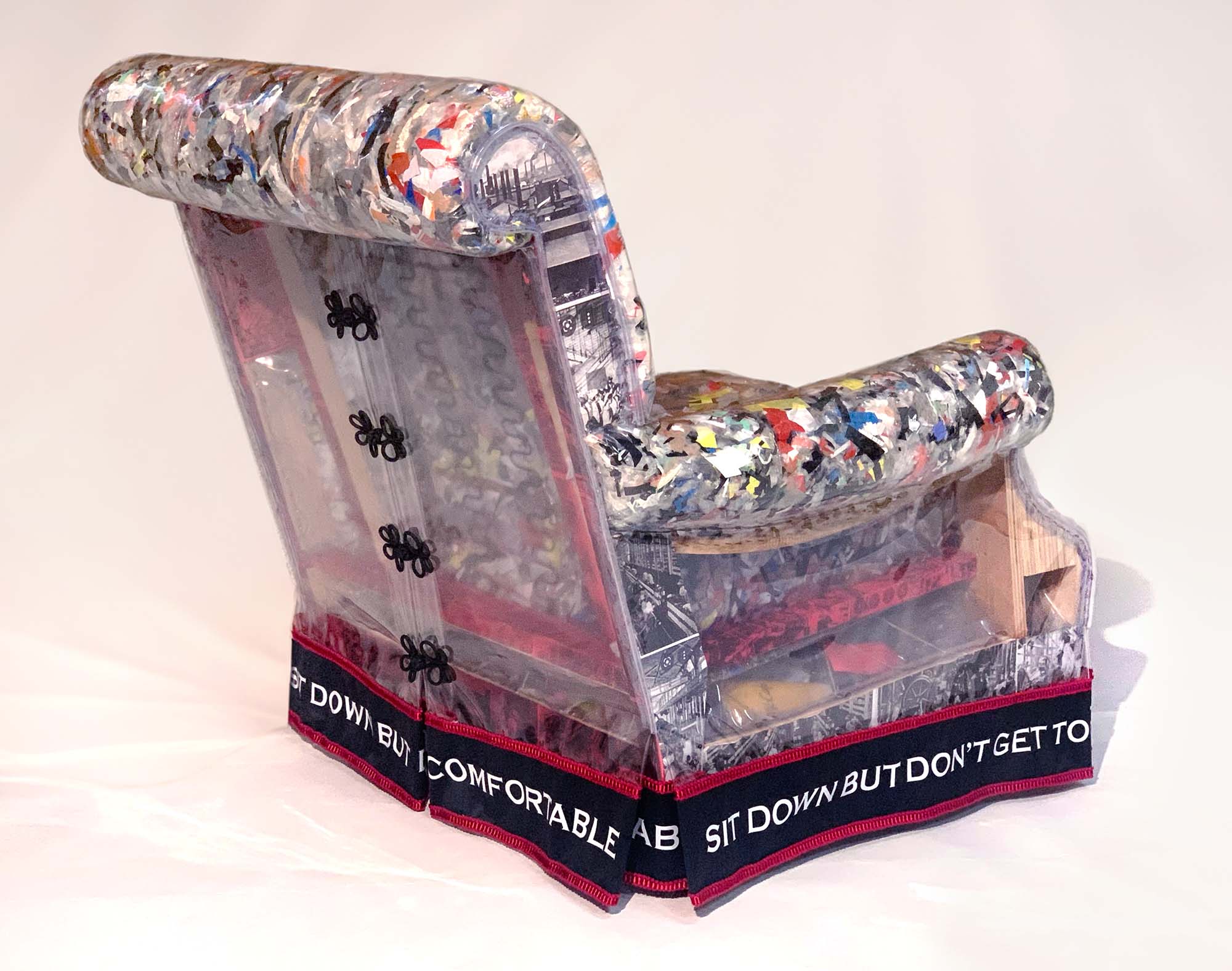 The second in a series, created by deconstructing discarded furniture found on the side of the road and re-upholstering it with transparent vinyl windows which allow for the trash within to be seen. Other portions are upholstered in custom fabric printed with photos of the shredded paper, plastics and materials that were collected throughout 2024 in an effort to make the studio waste-neutral.