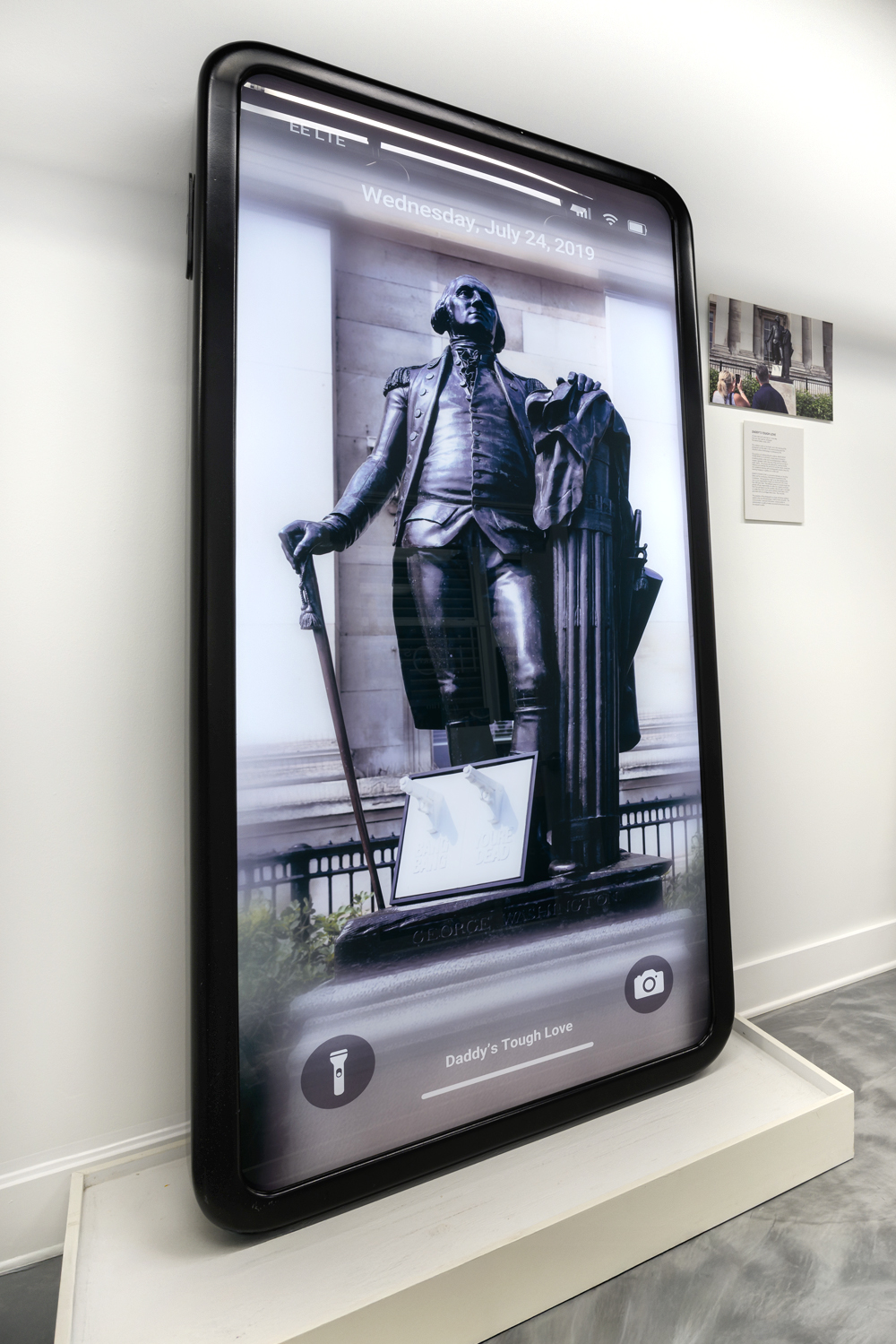 This work represents the complex function of our media devices today recording “truth”. The photograph was taken at the British Museum in London where I placed my piece Bang Bang You’re Dead at the base of the sculpture of George Washington. The title of the piece refers to the parental discipline required of children in need of nurturing in the face of bad choices. This piece brings to mind the issues of personal responsibility, the Constitution, The Second Amendment, and social responsibility.