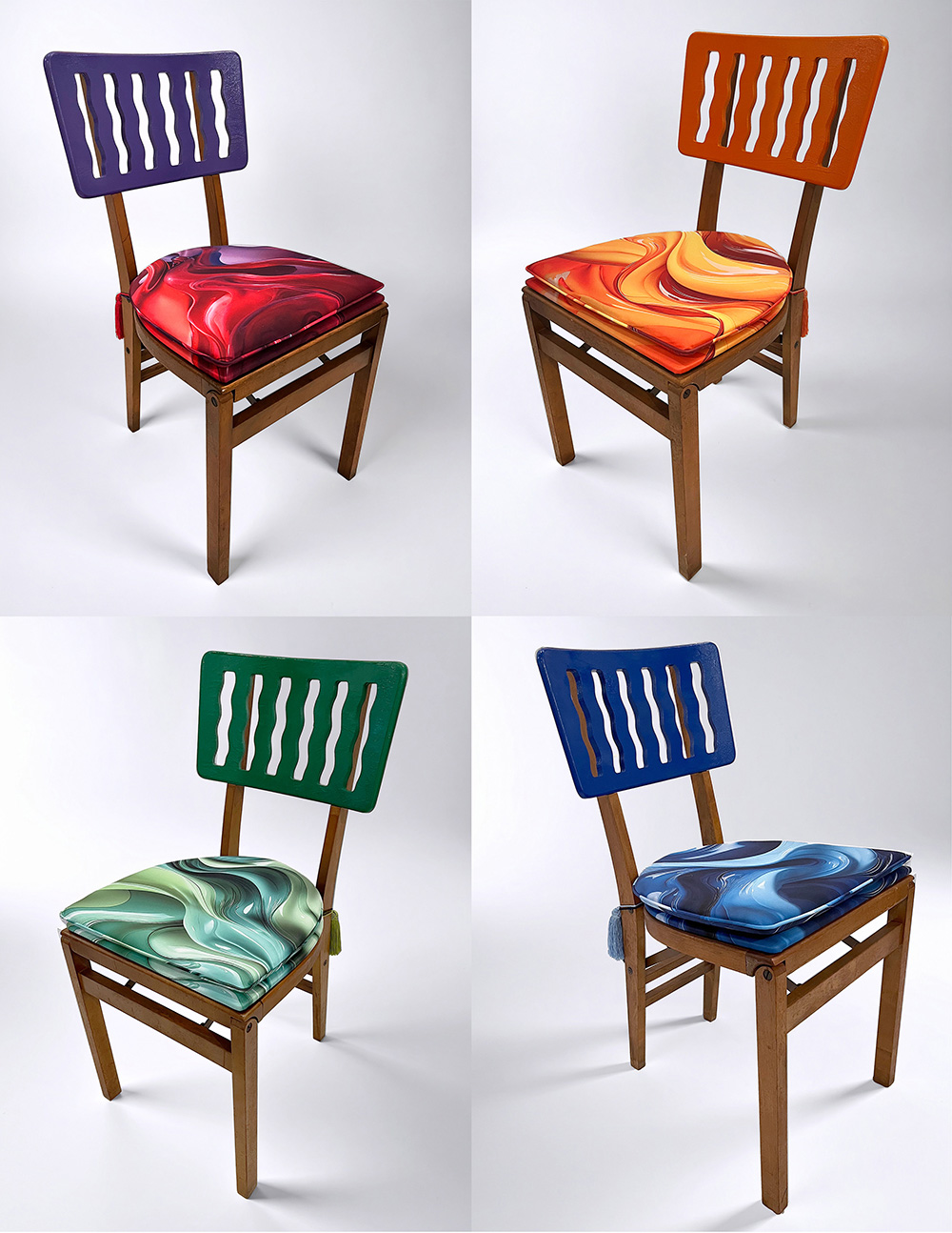 wood, vinyl wrap, vintage card chairs, paint, custom-printed fabric, metal, resin